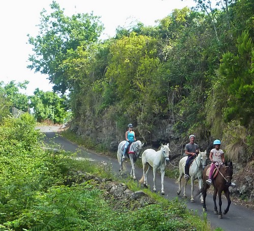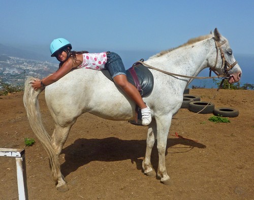 Wie fällt man richtig, ohne grösseren Schaden zu nehmen, wenn man auf dem Pferd ins Rutschen kommt. Der Theorie folgte der praktische Teil, wobei wir allerdings eine gemütliche Matratze zum Abrollen benutzten. Die Schülerinnen Veronika und Sarah übten zuerst, wie man sich vom stehenden, dann, wie man sich von einem sich bewegenden Pferd fallen lässt. Das Pferd Lucero, das zu diesem Zeitpunkt wegen einer Augenentzündung einen Mückenschutz über den Augen trug, machte alles brav mit.