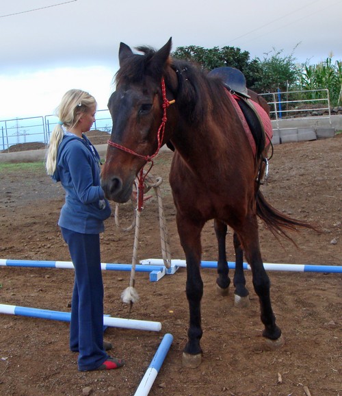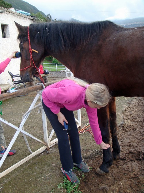 Alina versucht, ganz allein die Hufe zu säubern, und es klappt gut. Tyson passt dabei gut auf, ob was Leckeres aus den Hufen fällt.