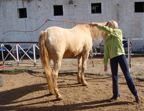 Alina übt mit Hilfe des Driving und des Porcupine Games, Sultan exakt durch eine Ecke zu bewegen, ohne dass er die Balken berührt. Hier gibt sie die Hilfe, um die Hinterhand zu bewegen.