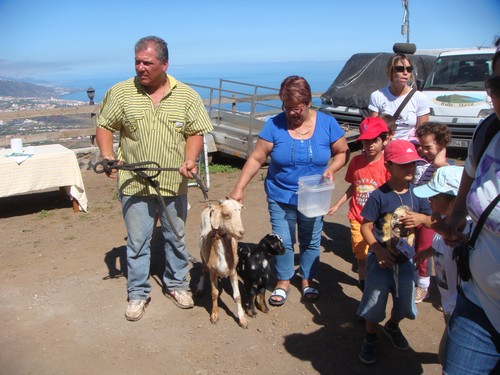Nach unserer Vorführung wird eine Ziegenfamilie bestaunt. Hier zeigt Manolo eine Ziegenmutter mit ihrem Nachwuchs, und die Besitzerin zeigt den Kindern, wie man eine Ziege melkt.