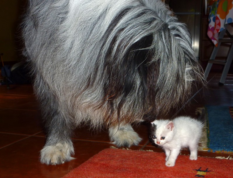 Mit Balu war ich verständlicherweise die nächsten Tage sehr vorsichtig, wenn ich ihn mit dem Kätzchen zusammen ließ und begleitete ihn ständig mit einer Hand an seinem Maul, damit ich ihn schneller abblocken könnte, wenn er noch einmal zuschnappen würde. Doch es wiederholte sich nichts dergleichen. Er war zwar in der ersten Woche immer noch sehr aufgeregt, wenn ich die beiden zusammen liess, doch es wurde täglich besser. Nach einer Woche begann er, die Kleine am Maul und Popo zu putzen, so, wie er es bei den anderen Kätzchen auch gemacht hatte.