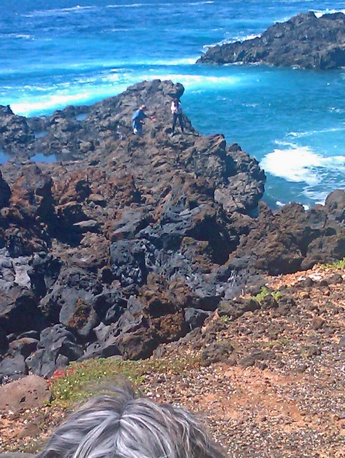 Wir fahren weiter bis an diesen Leuchtturm. Das Foto zeigt auf den Felsen Wolfgang und Desi, die gerade von einer Riesengischtwelle naß geworden sind. Eigentlich sollten dort tolle Starfotos entstehen, doch die waren buchstäblich ins Wasser gefallen.