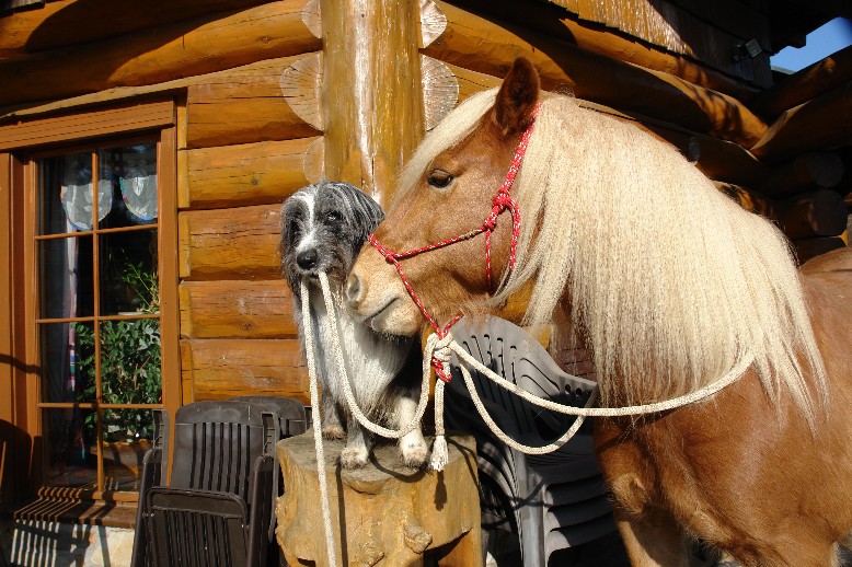 Ein halbes Jahr später konnte Balu mir das aufgehalfterte Pferd bereits am Seil bringen. Hier habe ich beide Tiere für ein Foto vor unserem Haus postiert.