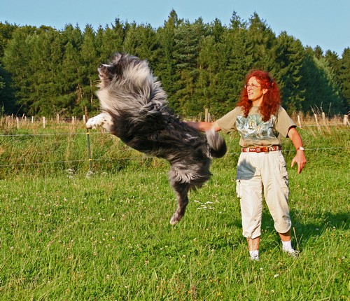 Frisbee Das Frisbee Spiel war mein Lieblingsspiel mit Balu, weil ich aktive Bewegung mit vielen Tricks verbinden konnte. Ich hatte diese speziellen weichen Frisbee Scheiben für Hunde in den USA entdeckt und brachte diese mit Anleitung zum Üben mit nach Hause. Balu lernte unglaublich schnell, diese fliegenden Scheiben zu fangen und dabei diverse Kunststücke auszuführen. Dazu gehörte u. A. das Überspringen oder Hinaufspringen auf meine Person oder der Sprung durch meine gespreizten Beine, wenn ich am Boden lag. Durch Profis in diesem neuen Hundesport lernte ich später noch bessere Wurftechniken und einige neue Tricks und konnte so auch abwechslungsreicher mit Balu spielen.